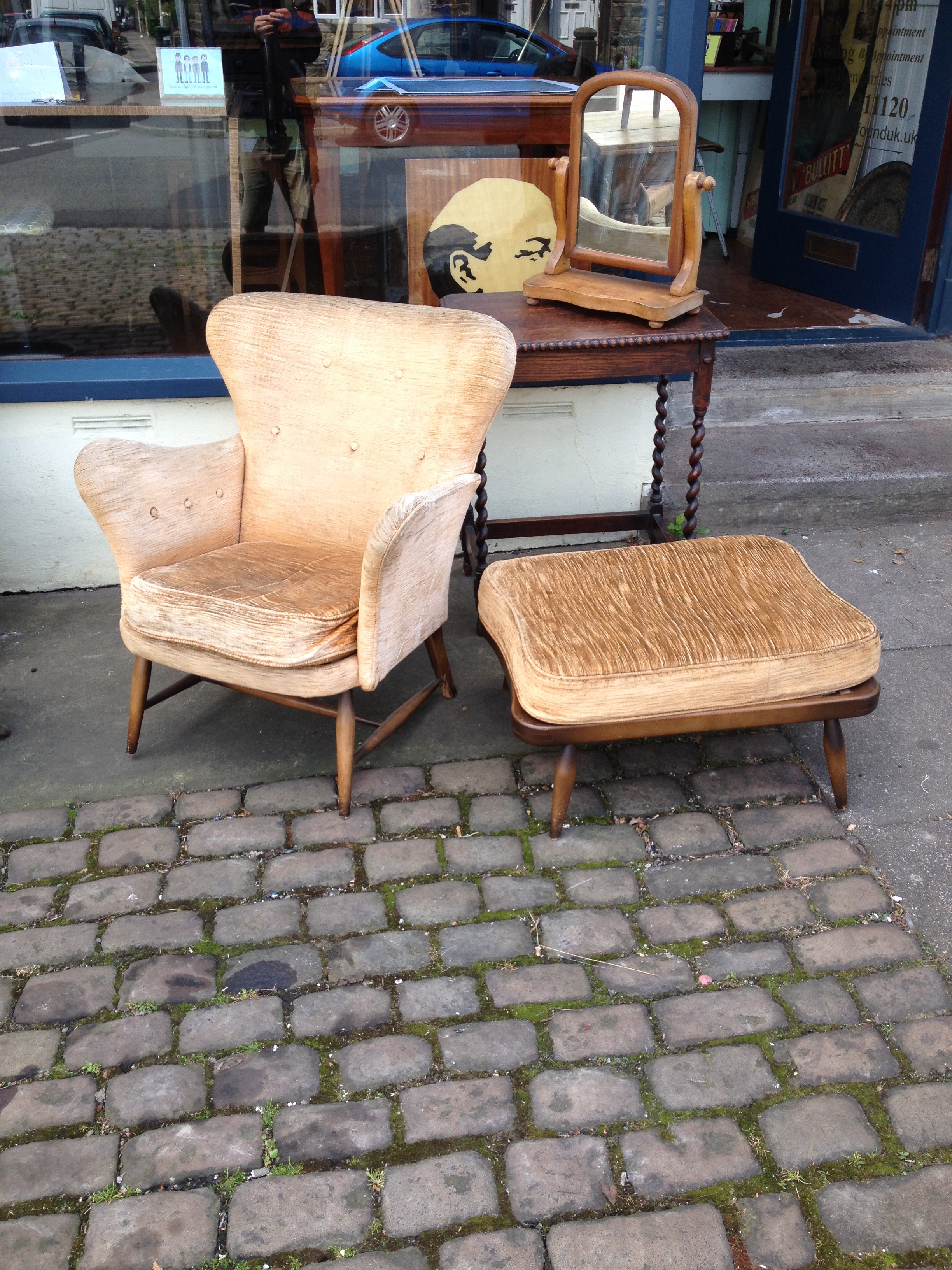 Previous Image Next Image 1953 ercol armchair and footstool pre re-upholstery pre recover – Ercol armchair and foot stool 1953 –
