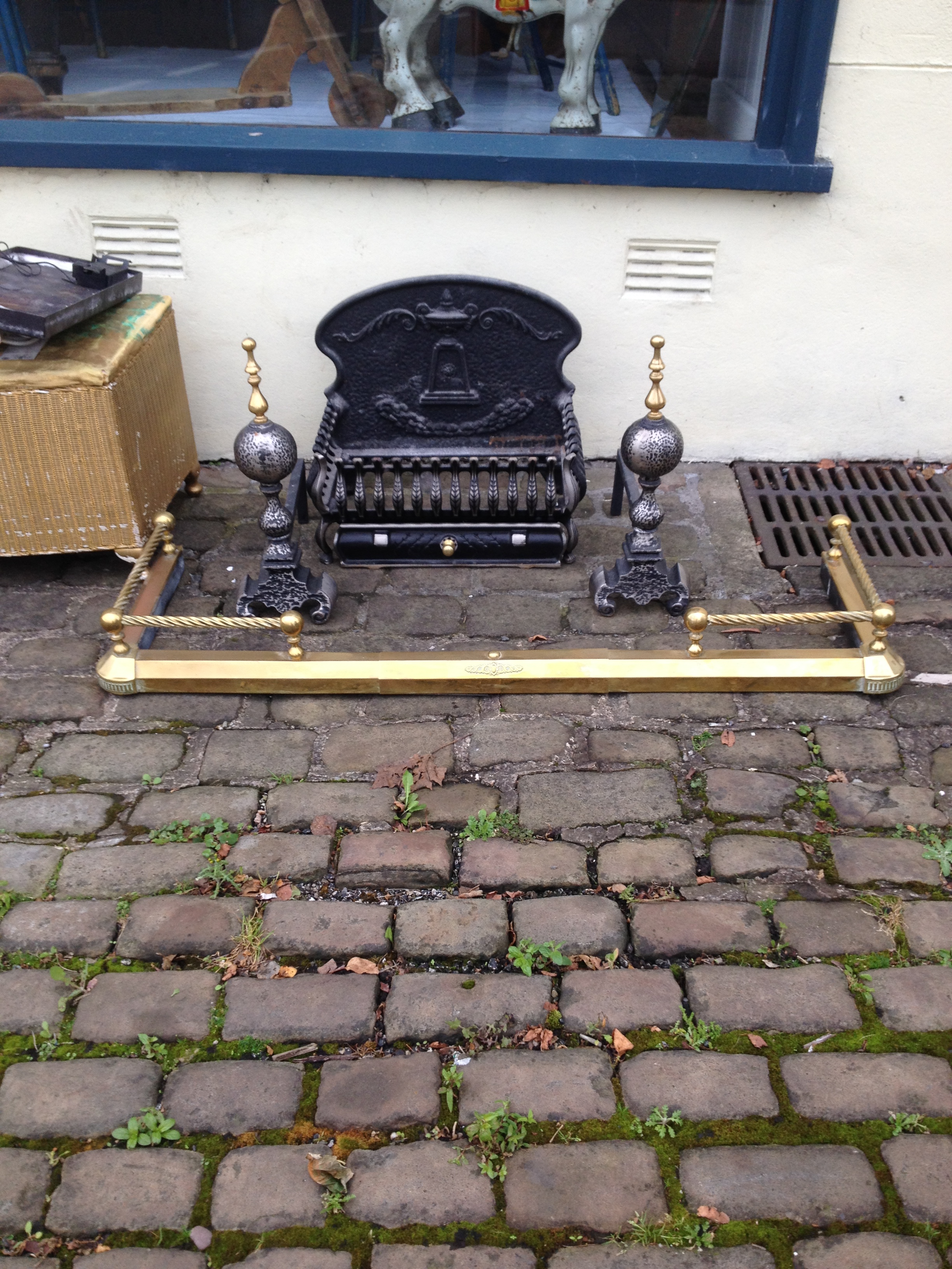 Previous Image Next Image cast iron grate Nice cast iron dog grate with fire dogs – £50 the brass kerb is £40